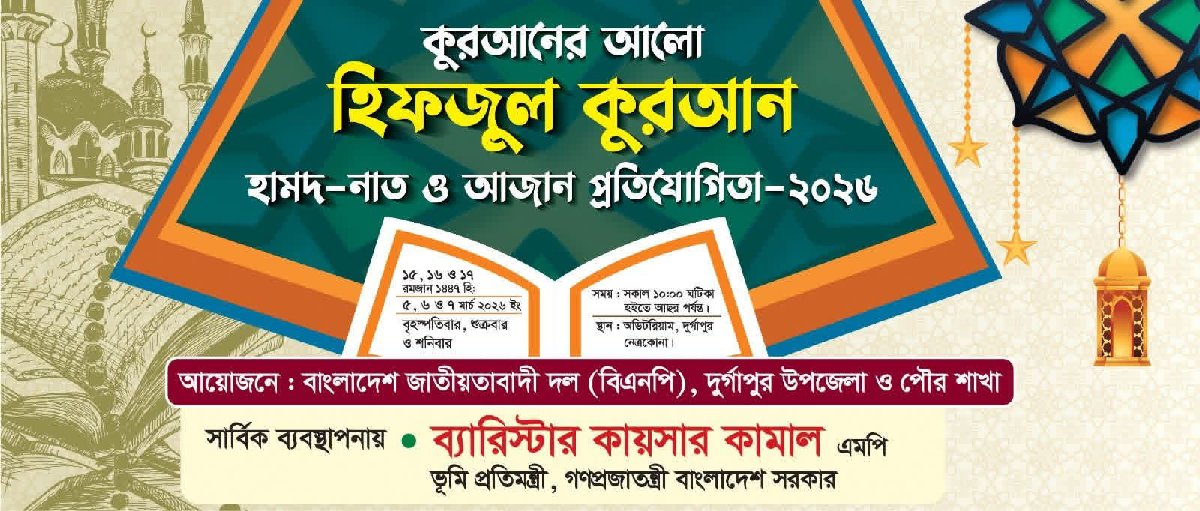 ভূমি প্রতিমন্ত্রী ও নেত্রকোণা ১ আসনের সংসদ সদস্য ব্যারিস্টার কায়সার কামালের সার্বিক ব্যবস্থাপনায় নেত্রকোণার দুর্গাপুর উপজেলায় শুরু হচ্ছে কুরআনের আলো হিফজুল কুরআন হামদ-নাত ও আজান প্রতিযোগিতা-২০২৬। তিনদিনব্যাপী এই আয়োজন শুরু হচ্ছে আগামী ৫ মার্চ। এটি চলবে ৭ মার্চ পর্যন্ত। বাংলাদেশ জাতীয়তাবাদী দল - বিএনপির দুর্গাপুর উপজেলা ও পৌর শাখা এই আয়োজন করছে। দুর্গাপুর পৌর শহরে জেলা পরিষদ অডিটোরিয়ামে প্রতিদিন সকাল ১০টায় এই প্রতিযোগিতা শুরু হয়ে চলবে বিকেল ৪:৩০ পর্যন্ত। গত বছর প্রথমবার এই আয়োজন করে উপজেলা বিএনপি। এবার ২য় বারের মতো এই আয়োজন অনুষ্ঠিত হচ্ছে। আয়োজকরা জানান, তরুণ প্রজন্মকে ইসলামের দীক্ষায় উজ্জীবিত এবং অনুপ্রাণিত করার লক্ষ্যে এই প্রতিযোগিতা আয়োজন করা হচ্ছে। তারা বলেন, এমন আয়োজনের মধ্য দিয়ে তরুণ প্রজন্মের মাঝে ইসলামী মূল্যবোধ ও সংস্কৃতি চর্চা আরো বৃদ্ধি পাবে। দুর্গাপুরে ২য় বারের মতো বৃহৎ পরিসরে আয়োজিত হিফজুল কুরআন হামদ-নাত ও আজান প্রতিযোগিতা ঘিরে স্থানীয় ধর্মপ্রাণ মুসলমান ও জনসাধারণের মধ্যে ব্যাপক আগ্রহ লক্ষ্য করা যাচ্ছে। এমন আয়োজনের মধ্য দিয়ে শিশু-কিশোরদের মধ্যে ইসলামী সংস্কৃতি চর্চার আগ্রহ বৃদ্ধি পাবে বলে আশাবাদ ব্যক্ত করেন সংশ্লিষ্টরা।