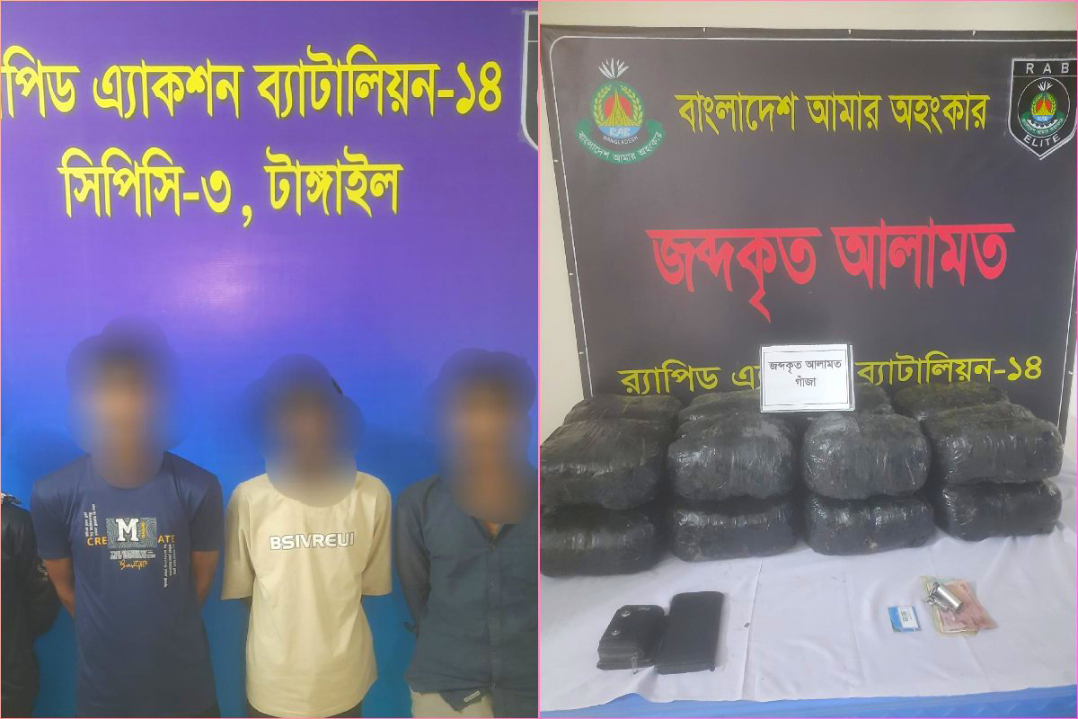 ৪১ কেজি ২০০ গ্রাম গাঁজাসহ চার মাদক কারবারি গ্রেফতার টাঙ্গাইল,২০ ফেব্রুয়ারি ২০২৬ ইং গোপন সংবাদের ভিত্তিতে পরিচালিত বিশেষ অভিযানে ৪১ কেজি ২০০ গ্রাম অবৈধ মাদক দ্রব্য গাঁজাসহ চারজন মাদক কারবারিকে গ্রেফতার করেছে র‍্যাব-১৪ এর সিপিসি-৩ টাঙ্গাইল ক্যাম্প।র‌্যাব সূত্র জানায় শুক্রবার দিবাগত রাত ৩টা ৩০ মিনিটে টাঙ্গাইল জেলার যমুনা পূর্ব সেতু থানাধীন ইব্রাহিমাবাদ রেলস্টেশন সংলগ্ন ঢাকা-সিরাজগঞ্জ মহাসড়কে একটি চেকপোস্ট স্থাপন করা হয়। এ সময় সন্দেহভাজন একটি ট্রাক থামিয়ে তল্লাশি চালানো হলে বিশেষ কায়দায় ত্রিফল দিয়ে ঢেকে রাখা অবস্থায় ৪১ কেজি ২০০ গ্রাম গাঁজা উদ্ধার করা হয়। গ্রেফতারকৃতরা হলো—মোঃ রাকিব আলী (২৫) সুনামগঞ্জ মোঃ জাকির হোসেন (৩১)নারায়ণগঞ্জ মোঃ লিমন মিয়া(২৪)সুনামগঞ্জমোঃ শাকিল আহম্মেদ (২০)কুমিল্লা।র‌্যাব জানায় উপস্থিত সাক্ষীদের সামনে প্রাথমিক জিজ্ঞাসাবাদে তারা মাদক বহনের কথা স্বীকার করে। অভিযানে ৪টি মোবাইল ফোন ও নগদ ১ হাজার ৬১০ টাকা জব্দ করা হয়। উদ্ধারকৃত গাঁজার আনুমানিক বাজারমূল্য ১২ লাখ ৩৬ হাজার টাকা।গ্রেফতারকৃতদের বিরুদ্ধে মাদকদ্রব্য নিয়ন্ত্রণ আইনে মামলা দায়েরের প্রস্তুতি চলছে। পরবর্তী আইনগত ব্যবস্থা গ্রহণের জন্য তাদের টাঙ্গাইল জেলার যমুনা পূর্ব সেতু থানায় হস্তান্তর করা হয়েছে।র‌্যাব জানিয়েছে মাদক নির্মূলে তাদের অভিযান অব্যাহত থাকবে এবং সমাজ থেকে মাদকের বিস্তার রোধে সকলের সহযোগিতা কামনা করা হয়েছে।