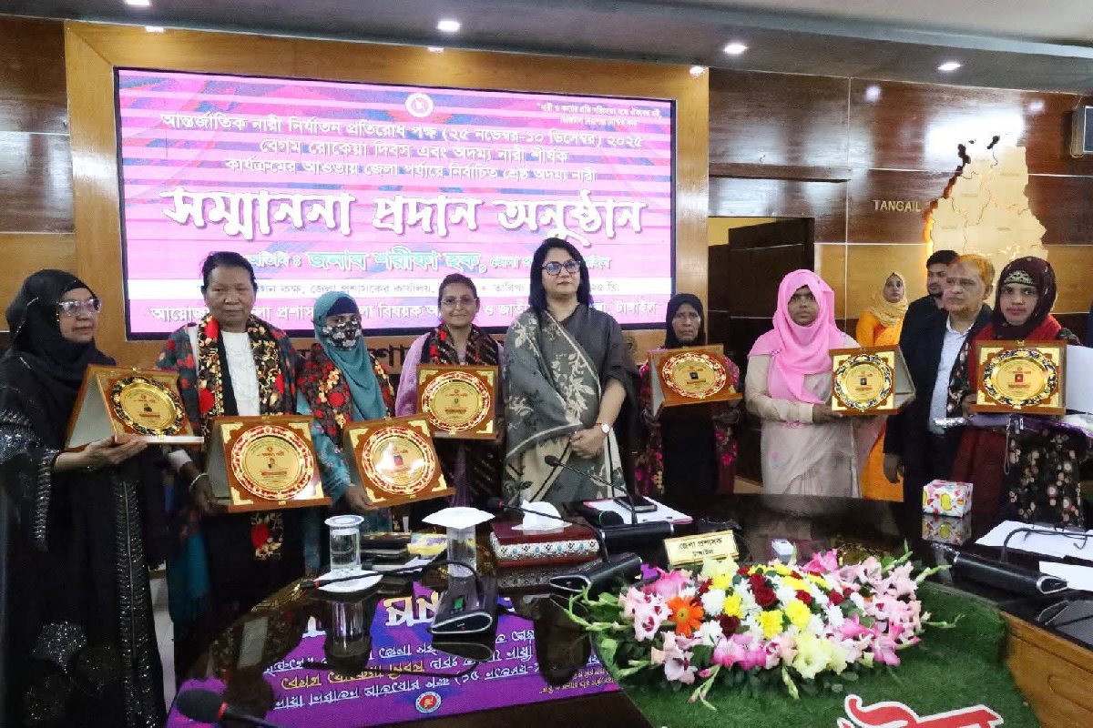 টাঙ্গাইলে যথাযথ মর্যাদা ও উৎসাহ-উদ্দীপনার মধ্য দিয়ে পালন করা হয়েছে আন্তর্জাতিক নারী নির্যাতন প্রতিরোধ পক্ষ ২০২৫ ও বেগম রোকেয়া দিবস-২০২৫। মঙ্গলবার (৯ ডিসেম্বর ২০২৫) সকাল থেকেই জেলা প্রশাসক কার্যালয় প্রাঙ্গণ ছিল প্রাণবন্ত ও ব্যস্ততম। দিনটি উপলক্ষে আয়োজন করা হয় বর্ণাঢ্য র‍্যালী, আলোচনা সভা ও শ্রেষ্ঠ ‘অদম্য নারী’ সম্মাননা প্রদান অনুষ্ঠান। সকাল ১০টায় জেলা প্রশাসনের উদ্যোগে বর্ণাঢ্য র‍্যালীটি জেলা প্রশাসক কার্যালয় থেকে শুরু হয়ে শহরের গুরুত্বপূর্ণ সড়কগুলো প্রদক্ষিণ করে। বিশিষ্ট নাগরিক, বিভিন্ন সরকারি-বেসরকারি প্রতিষ্ঠানের কর্মকর্তা-কর্মচারী, নারী সংগঠনের নেত্রীবৃন্দ, সামাজিক–সাংস্কৃতিক কর্মী ও শিক্ষার্থীদের অংশগ্রহণে র‍্যালীটি হয়ে ওঠে বর্ণিল ও প্রাণবন্ত। র‍্যালী শেষে জেলা প্রশাসকের সম্মেলন কক্ষে অনুষ্ঠিত হয় আলোচনা সভা। এবারের বেগম রোকেয়া দিবস-২০২৫ এর প্রতিপাদ্য “নারী ও কন্যার প্রতি সহিংসতা বন্ধে ঐক্যবদ্ধ হই, ডিজিটাল নিরাপত্তা নিশ্চিত করি”—এই প্রতিপাদ্যকে সামনে রেখে বক্তারা সমাজে নারী ও কন্যাশিশুর নিরাপত্তা, অধিকার প্রতিষ্ঠা, ডিজিটাল নিরাপত্তা সচেতনতা বৃদ্ধি এবং সহিংসতা প্রতিরোধে সবাইকে ঐক্যবদ্ধ হওয়ার আহ্বান জানান। বক্তারা বলেন, বেগম রোকেয়ার আদর্শ বাস্তবায়নে নারীর সামাজিক, অর্থনৈতিক ও ডিজিটাল ক্ষমতায়নকে আরও শক্তিশালী করতে হবে। আলোচনা সভা শেষে ‘অদম্য নারী’ শীর্ষক কার্যক্রমের আওতায় জেলা পর্যায়ে বিভিন্ন ক্ষেত্র থেকে নির্বাচিত শ্রেষ্ঠ অদম্য নারীদের হাতে সম্মাননা স্মারক তুলে দেন জেলা প্রশাসক, টাঙ্গাইল। সম্মাননা প্রাপ্ত নারীরা নিজেদের সংগ্রাম, সাফল্য ও সমাজে ইতিবাচক প্রভাব তৈরির অভিজ্ঞতা তুলে ধরেন। অনুষ্ঠানে উপস্থিত ছিলেন বিভিন্ন সরকারি দপ্তরের কর্মকর্তা, জনপ্রতিনিধি, নারী সংগঠনের নেতৃবৃন্দ, শিক্ষক, শিক্ষার্থী ও বিভিন্ন শ্রেণিপেশার মানুষ। পুরো আয়োজন জুড়ে ছিল নারী নির্যাতন প্রতিরোধে সামাজিক আন্দোলন গড়ে তোলার দৃঢ় প্রত্যয় এবং ডিজিটাল নিরাপত্তা নিশ্চিত করার আহ্বান। নারীর ক্ষমতায়ন, মর্যাদা ও অধিকার প্রতিষ্ঠার অঙ্গীকারে দিনব্যাপী এ আয়োজন টাঙ্গাইলে নতুন মাত্রা যোগ করেছে।