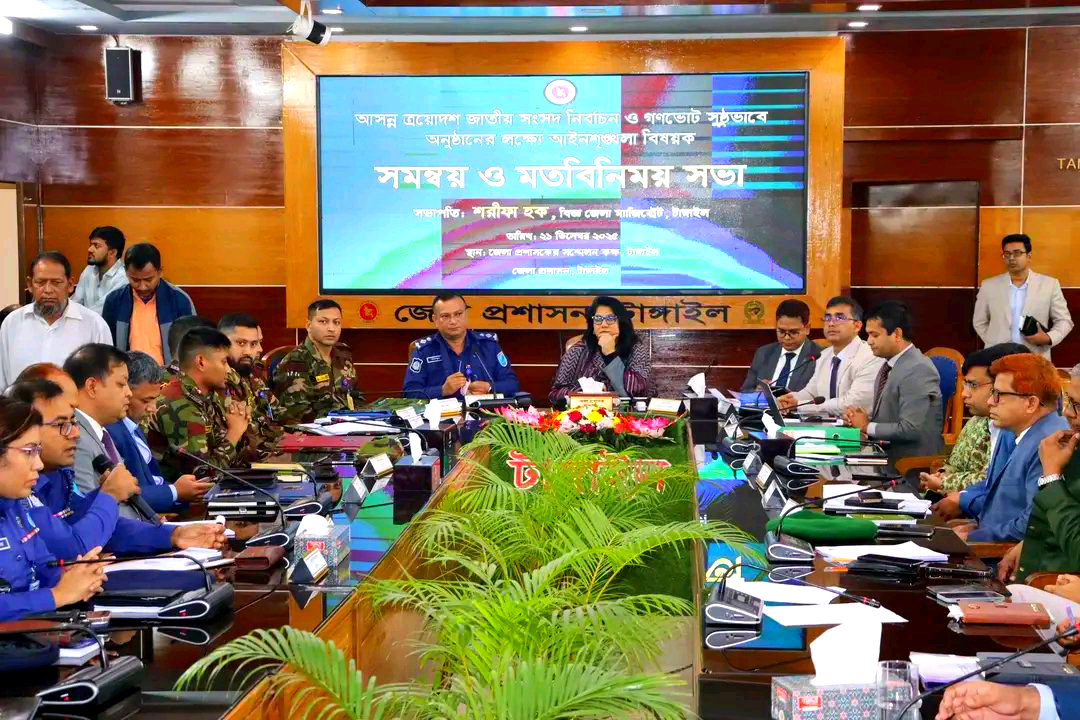 আসন্ন ত্রয়োদশ জাতীয় সংসদ নির্বাচন ও গণভোট সুষ্ঠুভাবে অনুষ্ঠানের লক্ষ্যে টাঙ্গাইলে আইনশৃঙ্খলা বিষয়ক সমন্বয় ও মতবিনিময় সভা অনুষ্ঠিত। আসন্ন ত্রয়োদশ জাতীয় সংসদ নির্বাচন ও গণভোট সুষ্ঠু, শান্তিপূর্ণ ও নিরপেক্ষভাবে সম্পন্ন করার লক্ষ্যে টাঙ্গাইলে আইনশৃঙ্খলা বিষয়ক সমন্বয় ও মতবিনিময় সভা অনুষ্ঠিত হয়েছে। রবিবার (২১ ডিসেম্বর ২০২৫ ইং) জেলা প্রশাসন, টাঙ্গাইল-এর উদ্যোগে জেলা প্রশাসকের সম্মেলন কক্ষে এ গুরুত্বপূর্ণ সভা অনুষ্ঠিত হয়। সভায় জেলার সার্বিক আইনশৃঙ্খলা পরিস্থিতি, নির্বাচনকালীন নিরাপত্তা ব্যবস্থা, ভোটগ্রহণ ও গণভোট চলাকালীন শৃঙ্খলা রক্ষা এবং সকল আইনশৃঙ্খলা রক্ষাকারী বাহিনীর মধ্যে সমন্বয় জোরদার বিষয়ে বিস্তারিত আলোচনা করা হয়। সভায় উপস্থিত ছিলেন টাঙ্গাইল জেলার পুলিশ সুপার জনাব মুহম্মদ শামসুল আলম সরকার। সভায় বক্তব্য প্রদানকালে তিনি বলেন, “আসন্ন ত্রয়োদশ জাতীয় সংসদ নির্বাচন ও গণভোট সুষ্ঠু, শান্তিপূর্ণ ও নিরপেক্ষভাবে সম্পন্ন করতে জেলা পুলিশ, টাঙ্গাইল-এর প্রতিটি সদস্য সর্বোচ্চ পেশাদারিত্ব, সততা ও নিষ্ঠার সঙ্গে দায়িত্ব পালন করবে। নির্বাচনকালীন সময়ে কোনো ধরনের বিশৃঙ্খলা, সহিংসতা কিংবা আইনবহির্ভূত কর্মকাণ্ড বরদাস্ত করা হবে না।” তিনি আরও বলেন, ভোটারদের নির্বিঘ্নে ভোটাধিকার প্রয়োগ নিশ্চিত করতে কেন্দ্রভিত্তিক নিরাপত্তা পরিকল্পনা গ্রহণ করা হয়েছে। নির্বাচনকে কেন্দ্র করে গুজব, অপপ্রচার ও যেকোনো ধরনের নাশকতামূলক কর্মকাণ্ড প্রতিরোধে জেলা পুলিশসহ অন্যান্য বাহিনী সর্বদা সতর্ক থাকবে। সভায় টাঙ্গাইলের জেলা প্রশাসক নির্বাচনকালীন প্রস্তুতি সম্পর্কে বক্তব্য প্রদান করেন এবং সকল বাহিনীর মধ্যে নিবিড় সমন্বয়ের ওপর গুরুত্বারোপ করেন। তিনি বলেন, একটি গ্রহণযোগ্য ও অংশগ্রহণমূলক নির্বাচন অনুষ্ঠানে প্রশাসন ও আইনশৃঙ্খলা বাহিনী সম্মিলিতভাবে কাজ করবে। এ সময় জেলা পুলিশের ঊর্ধ্বতন কর্মকর্তাবৃন্দ, র‍্যাব, বিজিবি, আনসার ও ভিডিপি, গোয়েন্দা সংস্থা, ফায়ার সার্ভিসসহ জেলার বিভিন্ন আইনশৃঙ্খলা রক্ষাকারী বাহিনীর প্রতিনিধিগণ উপস্থিত ছিলেন। এছাড়াও বিভিন্ন দপ্তরের কর্মকর্তা ও বিশিষ্ট ব্যক্তিবর্গ সভায় অংশগ্রহণ করেন। সভা শেষে আসন্ন ত্রয়োদশ জাতীয় সংসদ নির্বাচন ও গণভোট সুষ্ঠু ও শান্তিপূর্ণভাবে সম্পন্ন করতে জেলার সার্বিক আইনশৃঙ্খলা পরিস্থিতি আরও সুদৃঢ় করার দৃঢ় প্রত্যয় ব্যক্ত করা হয়।