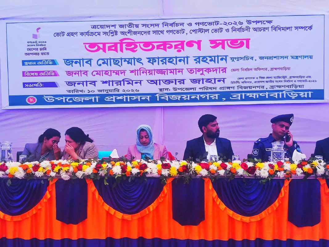 বিজয়নগরে ত্রয়োদশ জাতীয় নির্বাচন উপলক্ষে আচরণবিধি ও গণভোট বিষয়ে অবহিতকরণ সভা ত্রয়োদশ জাতীয় সংসদ নির্বাচন ও গণভোটকে সামনে রেখে ব্রাহ্মণবাড়িয়ার বিজয়নগরে নির্বাচনী আচরণ বিধি, গণভোট ও পোস্টাল ভোট বিষয়ে সংশ্লিষ্ট অংশীজনদের অবহিত করতে এক সভা অনুষ্ঠিত হয়েছে।শনিবার ১০-০১-২০২৬ ইং তারিখে দুপুরে বিজয়নগর উপজেলা পরিষদ চত্বরে এ সভার আয়োজন করা হয়। জেলা প্রশাসক ও রিটার্নিং অফিসার শারমিন আক্তার জাহানের সভাপতিত্বে এবং উপজেলা সহকারী কমিশনার (ভূমি) নাহিদ ফাতেমার সঞ্চালনায় সভাটি অনুষ্ঠিত হয়। সভায় প্রধান অতিথির বক্তব্যে জনপ্রশাসন মন্ত্রণালয়ের যুগ্ম সচিব মোছাম্মাৎ ফারহানা রহমান নির্বাচনী আচরণ বিধির বিভিন্ন দিক তুলে ধরেন। তিনি অবাধ, সুষ্ঠু ও নিরপেক্ষ নির্বাচন নিশ্চিত করতে সকলকে আইন মেনে চলার আহ্বান জানান এবং গণভোটে ব্যাপক অংশগ্রহণ নিশ্চিত করতে জনগণকে উৎসাহিত করেন।বিশেষ অতিথি হিসেবে বক্তব্য রাখেন উপজেলা নির্বাহী কর্মকর্তা (ইউএনও) হাছিবুর রহমান, জেলা তথ্য অফিসার দীপক চন্দ্র দাস বিজয়নগর থানার অফিসার ইনচার্জ (ওসি) এ কে ফজলুল হক এবং উপজেলা নির্বাচন কর্মকর্তা সাদমান সাকিব। বক্তারা নির্বাচনী পরিবেশ শান্তিপূর্ণ রাখতে প্রশাসন, আইনশৃঙ্খলা বাহিনী ও সাধারণ জনগণের সম্মিলিত ভূমিকার ওপর গুরুত্বারোপ করেন। সভায় বিভিন্ন শ্রেণি ও পেশার প্রতিনিধি, জনপ্রতিনিধি, রাজনৈতিক দলের কর্মী গণমাধ্যমকর্মী ও স্থানীয় গণ্যমান্য ব্যক্তিবর্গ উপস্থিত ছিলেন।সভাপতির বক্তব্যে জেলা প্রশাসক ও রিটার্নিং অফিসার শারমিন আক্তার জাহান বলেন, “নির্বাচন সুষ্ঠু ও নিরপেক্ষ রাখতে প্রশাসনের পক্ষ থেকে সব ধরনের প্রস্তুতি নেওয়া হয়েছে। কেউ যদি অশুভ শক্তি প্রয়োগ বা নির্বাচনকে প্রশ্নবিদ্ধ করার চেষ্টা করে তাহলে তাদের কালো হাত ভেঙে দেওয়া হবে।তিনি আরও বলেন নির্বাচন একটি গণতান্ত্রিক উৎসব। এ উৎসব সফল করতে সকলের সহযোগিতা অপরিহার্য।
