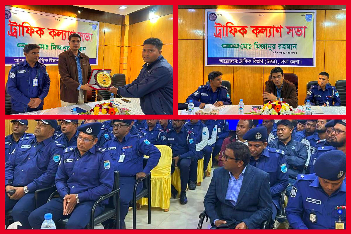 ঢাকা জেলা সাভার ট্রাফিক বিভাগ (উত্তর) এর কল্যাণ সভা অনুষ্ঠিত ১০ জানুয়ারি ২০২৬ ঢাকা জেলা ট্রাফিক বিভাগ (উত্তর)-এর উদ্যোগে সাভার ট্রাফিক কার্যালয়ে এক গুরুত্বপূর্ণ কল্যাণ সভা অনুষ্ঠিত হয়েছে। সভায় ট্রাফিক ব্যবস্থাপনার সার্বিক উন্নয়ন দায়িত্ব পালনে শৃঙ্খলা ও পেশাদারিত্ব বজায় রাখার ওপর বিশেষ গুরুত্বারোপ করা হয়।কল্যাণ সভায় প্রধান অতিথি হিসেবে উপস্থিত ছিলেন ঢাকা জেলার সম্মানিত পুলিশ সুপার জনাব মোঃ মিজানুর রহমান। তিনি তার বক্তব্যে সাভার ট্রাফিক বিভাগের সামগ্রিক আইনশৃঙ্খলা ও ট্রাফিক ব্যবস্থাপনা পরিস্থিতি পর্যালোচনা করেন। একই সঙ্গে দায়িত্ব পালনে সততা, শৃঙ্খলা ও পেশাদারিত্ব বজায় রাখার জন্য ট্রাফিক পুলিশের সকল সদস্যকে দিকনির্দেশনা প্রদান করেন। প্রধান অতিথি বলেন, সড়কে যানবাহন চলাচল নিরাপদ সুশৃঙ্খল ও নির্বিঘ্ন রাখতে আধুনিক ও জনবান্ধব ট্রাফিক ব্যবস্থাপনা নিশ্চিত করা অত্যন্ত জরুরি। এ লক্ষ্যে ট্রাফিক পুলিশের প্রতিটি সদস্যকে আন্তরিকতা ও নিষ্ঠার সঙ্গে দায়িত্ব পালন করতে হবে, যাতে সাধারণ জনগণ নিরাপদে ও সময়মতো নিজ নিজ গন্তব্যে পৌঁছাতে পারেন। বক্তব্যের শেষে ট্রাফিক ব্যবস্থাপনায় নিষ্ঠা দক্ষতা ও পেশাদারিত্বের সঙ্গে দায়িত্ব পালনকারী কর্মকর্তাদের মাঝে যোগ্যতা অনুযায়ী সম্মাননা স্মারক প্রদান করেন প্রধান অতিথি। এ সময় সভায় আরও উপস্থিত ছিলেন জনাব আরাফাতুল ইসলাম অতিরিক্ত পুলিশ সুপার (ক্রাইম অপস্ এন্ড ট্রাফিক উত্তর) জনাব মোঃ আসাদুজ্জামান অতিরিক্ত পুলিশ সুপার (সাভার সার্কেল)সহ সাভার ট্রাফিক বিভাগের ঊর্ধ্বতন কর্মকর্তাবৃন্দ।