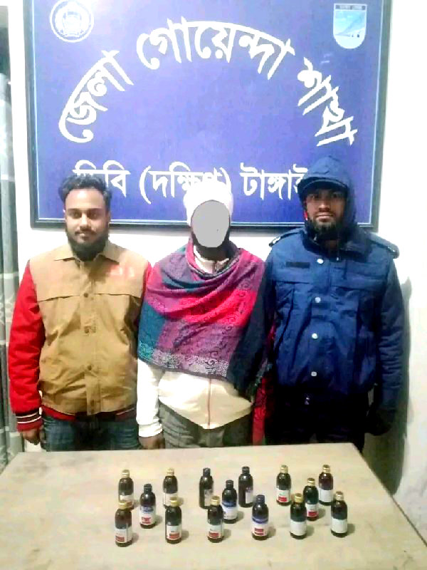 ডিবি (দক্ষিণ), টাঙ্গাইলের অভিযানে মাদক উদ্ধার এক মাদক ব্যবসায়ী গ্রেফতার। জেলা গোয়েন্দা শাখা ডিবি (দক্ষিণ) টাঙ্গাইলের একটি সফল অভিযানে বিপুল পরিমাণ মাদকদ্রব্য উদ্ধার করা হয়েছে। এ সময় একজন চিহ্নিত মাদক ব্যবসায়ীকে গ্রেফতার করা হয়। ডিবি সূত্রে জানা যায় গোপন সংবাদের ভিত্তিতে ডিবি (দক্ষিণ)টাঙ্গাইলের একটি চৌকস দল মির্জাপুর থানাধীন গোড়াই ইউনিয়নের রানাশাল এলাকায় মাদকবিরোধী বিশেষ অভিযান পরিচালনা করে। অভিযানে ১০ (দশ) বোতল Wincerex Syrup (১০০ মি.লি.) এবং ০৫ (পাঁচ) বোতল ESkuf Cough Syrup (১০০ মি.লি.) উদ্ধার করা হয়। একই সঙ্গে ঘটনাস্থল থেকে একজন মাদক ব্যবসায়ীকে হাতেনাতে গ্রেফতার করা হয়। ডিবি কর্মকর্তারা জানান উদ্ধারকৃত মাদকদ্রব্যের আনুমানিক বাজারমূল্য প্রায় ৩০,০০০ (ত্রিশ হাজার) টাকা। প্রাথমিক জিজ্ঞাসাবাদে গ্রেফতারকৃত ব্যক্তি দীর্ঘদিন ধরে মাদক ব্যবসার সঙ্গে জড়িত থাকার কথা স্বীকার করেছে বলে জানা গেছে। গ্রেফতারকৃত আসামির বিরুদ্ধে মাদকদ্রব্য নিয়ন্ত্রণ আইনে মির্জাপুর থানায় নিয়মিত মামলা দায়েরের প্রস্তুতি চলছে। আইনগত প্রক্রিয়া শেষে তাকে বিজ্ঞ আদালতে সোপর্দ করা হবে।ডিবি (দক্ষিণ) টাঙ্গাইলের পক্ষ থেকে জানানো হয়, জেলার আইনশৃঙ্খলা পরিস্থিতি স্বাভাবিক রাখতে এবং মাদকের ভয়াবহতা রোধে এ ধরনের অভিযান অব্যাহত থাকবে।