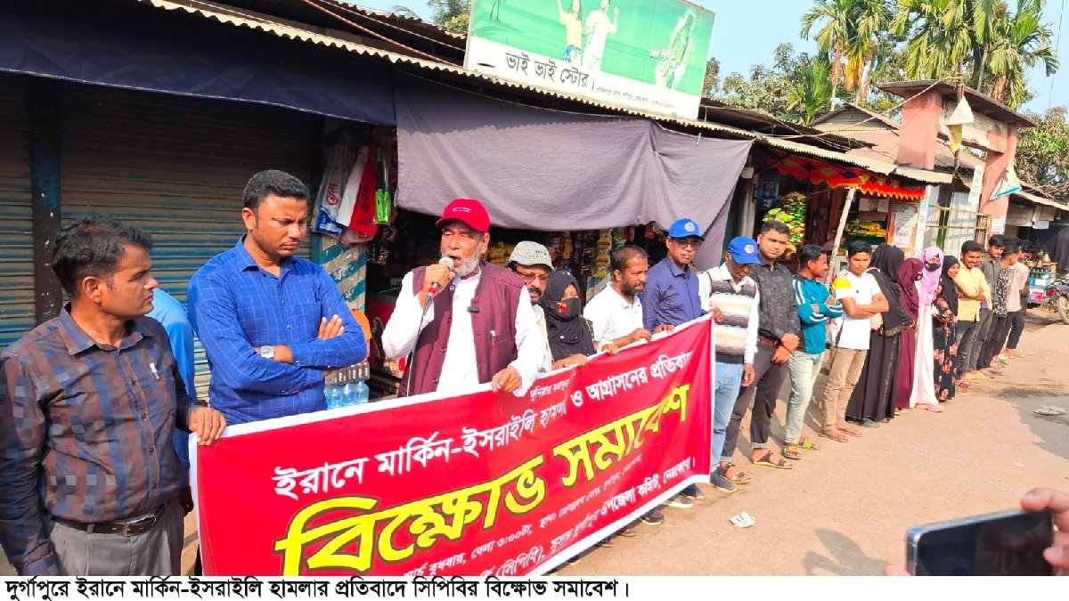 ইরানে মার্কিন-ইসরাইলি বাহিনীর হামলা, যৌথ আগ্রাসনে মধ্যপ্রাচ্যব্যাপী যুদ্ধ ও গণহত্যার প্রতিবাদে বাংলাদেশের কমিউনিস্ট পার্টি (সিপিবি) দুর্গাপুর উপজেলা কমিটির উদ্যোগে এক বিক্ষোভ সমাবেশ পালিত হয়েছে। বুধবার (০৪ মার্চ) বিকেলে দুর্গাপুর প্রেসক্লাব মোড়ে এ বিক্ষোভ মিছিল ও সমাবেশ অনুষ্ঠিত হয়। সমাবেশে সিপিবির সভাপতি আলকাস উদ্দীন মীরের সভাপতিত্বে, সহ:সাধারণ সম্পাদক মো. নজরুল ইসলামের সঞ্চালনায়, সিপিবির সাধারণ সম্পাদক মোরশেদ আলম, উদীচী সভাপতি শামছুল আলম খান সহ ছাত্র ইউনিয়ন, যুব ইউনিয়ন, আদিবাসী ইউনিয়ন, নারীসেল, ক্ষেতমজুর সমিতির নেতৃবৃন্দ বক্তব্য রাখেন। বক্তারা বলেন, মার্কিন যুক্তরাষ্ট্র ও তার মিত্রদের দস্যুতা গোটা পৃথিবীকে নতুন করে এক মহাযুদ্ধের ঝুঁকির মুখে ফেলেছে। ইরানে সামরিক হামলা, রাজনৈতিক নেতৃবৃন্দকে হত্যা, স্কুলে বোমা হামলা চালিয়ে নির্বিচারে শিশু হত্যা, এমনকি ইরানের সরকারবিরোধী আন্দোলনরত বামপন্থী ও অপরাপর বিরোধী শক্তির অবস্থানসমূহে বোমা হামলা পরিচালনা করে মার্কিন ও ইসরায়েল বাহিনী গোটা মধ্যপ্রাচ্যে যুদ্ধের আগুন ছড়িয়ে দিয়েছে। আমরা এর তীব্র প্রতিবাদ ও নিন্দা জানাচ্ছি। বক্তারা আরো বলেন, পৃথিবী আজ ফ্যাসিবাদ, যুদ্ধ ও পরিবেশ ধ্বংসের এক নতুন যুগে প্রবেশ করেছে। এককেন্দ্রিক বিশ্বে মার্কিন সাম্রাজ্যবাদী আধিপত্য গোটা পৃথিবীকে এমনভাবে গ্রাস করেছে যে, বিভিন্ন জাতি ও রাষ্ট্রের স্বাধীনতা-সার্বভৌমত্বের ধারণা আজ অর্থহীন হয়ে পড়েছে। ইরানে নতুন করে এই সামরিক অভিযান একটি মানবতাবিরোধী, ইরানের স্বাধীনতা ও সার্বভৌমত্ববিরোধী আগ্রাসন এই বর্বরতা প্রতিবাদ থেকে বিরত থাকা বা দ্ব্যর্থতা প্রদর্শনের কোনো সুযোগ নেই। পৃথিবীর শান্তিকামী মানুষের পাশাপাশি বাংলাদেশের মুক্তিকামী জনতার প্রতি এই আগ্রাসনের বিরুদ্ধে সংহতি আন্দোলন গড়ে তোলার আহ্বান জানান।