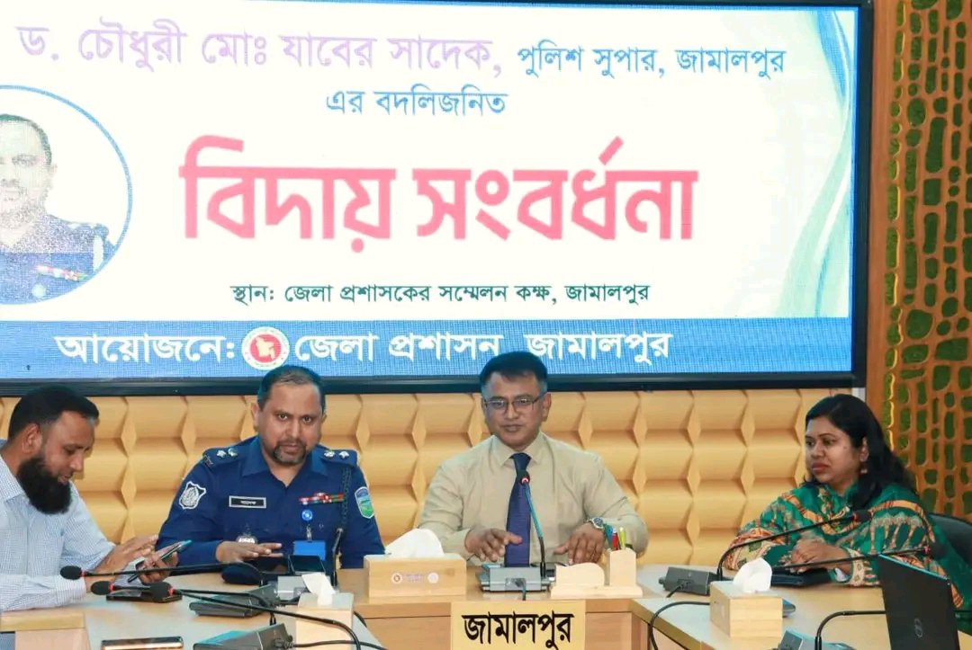 জামালপুরে পুলিশ সুপারের বদলিজনিত বিদায় সংবর্ধনা জেলা প্রশাসন জামালপুরের উদ্যোগে পুলিশ সুপার ড.চৌধুরী মোঃ যাবের সাদেকের বদলিজনিত বিদায় সংবর্ধনা অনুষ্ঠিত হয়েছে।মঙ্গলবার (১০ মার্চ ২০২৬) জেলা প্রশাসকের কার্যালয়ের সম্মেলন কক্ষে আয়োজিত এ অনুষ্ঠানে সভাপতিত্ব করেন জেলা প্রশাসক ও বিজ্ঞ জেলা ম্যাজিস্ট্রেট জনাব মুহাম্মদ ইউসুপ আলী।অনুষ্ঠানে জেলার বিভিন্ন সরকারি দপ্তরের কর্মকর্তাবৃন্দ উপস্থিত ছিলেন। বক্তারা বিদায়ী পুলিশ সুপার ড. চৌধুরী মোঃ যাবের সাদেকের কর্মময় জীবনের বিভিন্ন দিক স্মরণ করেন এবং জামালপুর জেলায় দায়িত্ব পালনকালে তাঁর নিষ্ঠা পেশাদারিত্ব ও দক্ষ নেতৃত্বের প্রশংসা করেন।বক্তারা বলেন দায়িত্ব পালনের সময় তিনি আইন-শৃঙ্খলা রক্ষা অপরাধ দমন ও জনসেবামূলক কর্মকাণ্ডে গুরুত্বপূর্ণ অবদান রেখেছেন। অনুষ্ঠানের শেষে উপস্থিত সবাই তাঁর ভবিষ্যৎ কর্মজীবনের সর্বাঙ্গীন সফলতা কামনা করেন।