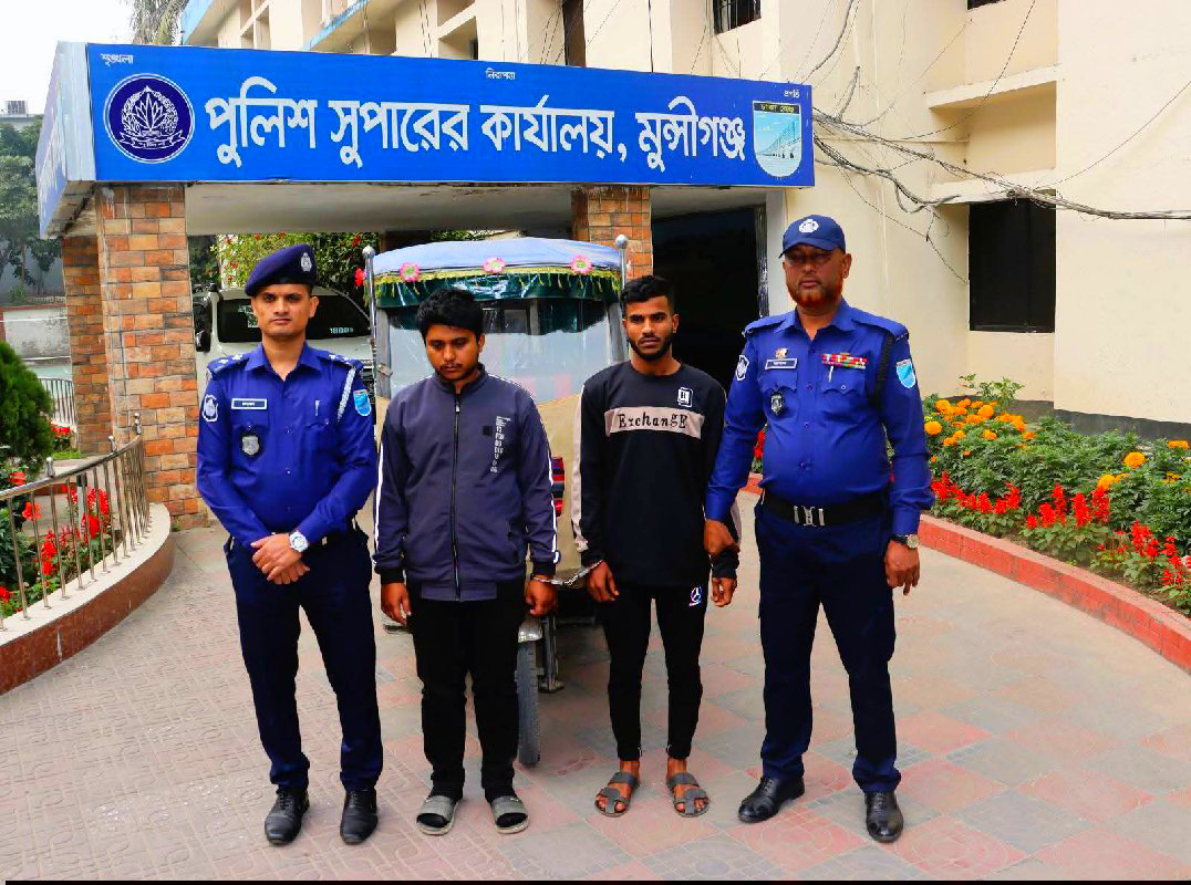 ক্লুলেস ও চাঞ্চল্যকর হত্যা মামলার রহস্য উদঘাটন ও আসামী গ্রেফতার গত ০৬/১২/২০২৫ খ্রি. দুপুর আনুমানিক ১৪.৩০ ঘটিকার সময় গজারিয়া থানাধীন বাউশিয়া ইউনিয়নের কাঞ্চন নদীতে অজ্ঞাতনামা এক ব্যক্তির লাশ ভেসে আছে এমন সংবাদের ভিত্তিতে গজারিয়া থানা পুলিশ দ্রুত ঘটনাস্থলে পৌঁছায়। পরবর্তীতে উক্ত ঘটনাটি জনসাধারণের মধ্যে ছড়িয়ে পরে। এমন সংবাদ পেয়ে ঐদিনই ভিকটিমের আপন বড় ভাই জাহাঙ্গীর আলম ঘটনাস্থলে উপস্থিত হয়ে উক্ত লাশটি তার আপন ছোট ভাই মো.শাহজালাল (২৭),পিতা-মৃত আব্দুল মালেক, সাং-বক্তারকান্দি,থানা-গজারিয়া, জেলা-মুন্সীগঞ্জ বলে শনাক্ত করেন। পরবর্তীতে তিনি আরো জানান যে, তার ছোট ভাই পেশায় একজন অটোরিক্সা চালক। অজ্ঞাতনামা আসামীরা তার ছোট ভাইকে হাত পা বেঁধে কাঞ্চন নদীতে ফেলে নৃসংশভাবে হত্যাকরে তার অটোরিক্সাটি ছিনতাই করে নিয়ে যায়। এই ঘটনায় ভিকটিমের বড় ভাই জাহাঙ্গীর আলম বাদী হয়ে অজ্ঞাতনামা আসামীদের বিরুদ্ধে গজারিয়া থানায় মামলা নং-০৫(১২)২৫, ধারা-৩০২/২০১/৩৪ পেনাল কোড ১৮৬০; দায়ের করেন।উক্ত ঘটনার মূল রহস্য উদঘাটন, আসামী গ্রেফতার ও ছিনতাইকৃত ইজিবাইকটি উদ্ধারের লক্ষ্যে মুন্সীগঞ্জ জেলার সুযোগ্য পুলিশ সুপার জনাব মোঃ মেনহাজুল আলম পিপিএম মহোদয়ের সার্বিক দিক-নির্দেশনায় এবং অতিরিক্ত পুুলিশ সুপার ( ক্রাইম অ্যান্ড অপস্) মোঃ ফিরোজ কবিরের তত্বাবধানে এসআই (নিঃ) রুবেল সিকদারের নেতৃত্বে গজারিয়া থানা পুলিশের একটি চৌকস টিম উক্ত মামলার তদন্তে নেমে সম্ভাব্য বিভিন্ন স্থানে অভিযান চালায়। এরই ধারাবাহিকতায় তথ্য উপাত্তের ভিত্তিতে গতকাল ০৯/০১/২০২৬ খ্রিঃ তারিখ সন্ধ্যা আনুমানিক ১৮:০৫ ঘটিকার সময় চাঁদপুর জেলার মতলব উত্তর থানাধীন পাঁচগাছিয়া এলাকা থেকে ভিকটিম এর বন্ধু ১. ইব্রাহিম ওরফে সাগর (২৮), পিতা- শুক্কুর আলী, সাং-নতুন বলাকি, থানা- গজারিয়া, জেলা- মুন্সীগঞ্জকে গ্রেফতার করেন। গ্রেফতারকৃত আসামী ইব্রাহিম ওরফে সাগরকে প্রাথমিক জিজ্ঞাসাবাদ কালীন সময়ে তার দেওয়া তথ্যের ভিত্তিতে অভিযান পরিচালনা করে অপর আসামী ২.ফাহিম (২৪), পিতা-খোরশেদ, মাতা-মৃত ফাতেমা বেগম, সাং- দাউদেরখাড়া, ইউপি- জগন্নাথপুর, থানা-কুমিল্লা কোতোয়ালী, জেলা-কুমিল্লাকে একই দিন রাত আনুমানিক ২১:০৫ ঘটিকার সময় গজারিয়া থানাধীন ভবেরচর বাসস্ট্যান্ড এলাকা হতে গ্রেফতার করা হয়। পরবর্তীতে ফাহিমকে জিজ্ঞাসাবাদে জানায় যে, ছিনতাইকৃত অটোরিক্সাটি ১নং আসামী ইব্রাহীম ওরফে সাগর এর নিকট থেকে ক্রয় করে তিনি তার বাবা খোরশেদকে জীবিকা নির্বাহের জন্য দেন। ফাহিমের দেওয়া তথ্যের ভিত্তিতে কুমিল্লার কোতয়ালী থানাধীন দাউদেরখাড়া সাকিনস্থ তার নিজ বাড়ী থেকে অটোরিক্সাটি উদ্ধার পূর্বক জব্দ করা হয়।