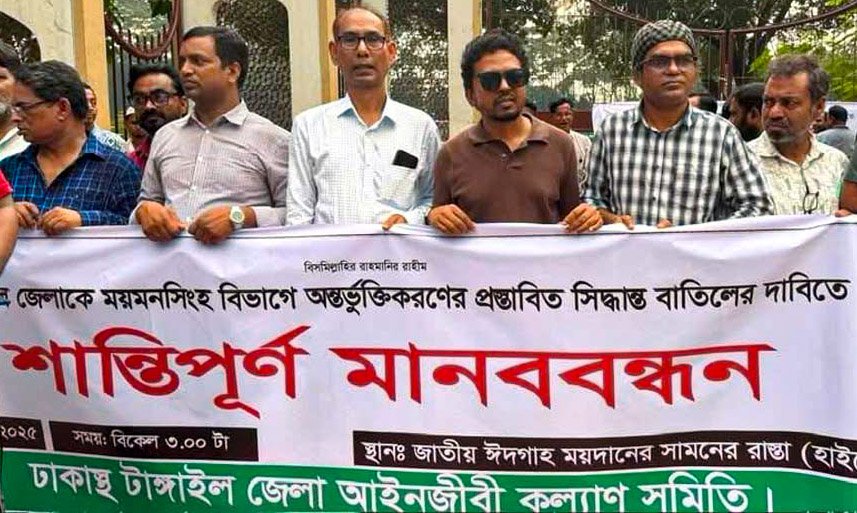 টাঙ্গাইলকে ময়মনসিংহ বিভাগে অন্তর্ভুক্ত করার প্রস্তাবনার প্রতিবাদে মানববন্ধন করেছে ঢাকায় বসবাসরত শিক্ষার্থী ও সাধারণ মানুষ। বুধবার (২২ অক্টোবর) বিকেলে রাজধানীর হাইকোর্টের সামনে এ মানববন্ধন অনু্‌ষ্ঠিত হয়। মানববন্ধনে অংশ নেওয়া টাঙ্গাইলবাসীরা জানান, টাঙ্গাইলকে ময়মনসিংহ বিভাগে অন্তর্ভুক্ত করার প্রস্তাব তারা মেনে নেবেন না। টাঙ্গাইল নিয়ে টানাহেঁচড়া চলবে না। টাঙ্গাইল ৪২ লক্ষ্য মানুষের একটি বড় জেলা যেটি ময়মনসিংহ এর থেকে অধিক উন্নত ব্যবস্থা রয়েছে বক্তারা আরো বলেন,আমাদের কে বার বার এমনভাবে হয়রানি করা যাবে না আর যদি টাঙ্গাইলকে জোর পূর্বক ময়মনসিংহ বিভাগে দেওয়া হয় আমরা কঠিন প্রতিবাদ করবো এবং যদি ঢাকা বিভাগে না থাকে, তাহলে একে স্বাধীন বিভাগ হিসেবে ঘোষণা করতে হবে। মানববন্ধনে অংশ নিয়ে ঢাকা মহানগর পশ্চিম ছাত্রদলের সভাপতি রবিন খান বলেন, ঐতিহ্যবাহী টাঙ্গাইল জেলাকে ময়মনসিংহ বিভাগে অন্তর্ভুক্ত করাকে আমি ষড়যন্ত্র বলেই মনে করছি। এই সিদ্ধান্ত থেকে সরে আসার জন্য সংশ্লিষ্টদের কাছে জোর দাবি জানাচ্ছি। তা না হলে টাঙ্গাইলের সর্বস্তরের মানুষ আন্দোলন-সংগ্রাম করে এই ষড়যন্ত্রমূলক সিদ্ধান্ত বাতিল করতে বাধ্য করবে। টাঙ্গাইল ঢাকার সঙ্গেই থাকবে, উল্টো পথে হাঁটবে না। ছাত্রদল কেন্দ্রীয় সংসদের সহ-সভাপতি আরিফুর রহমান আরিফ বলেন, কোথাও মধু কিংবা সোনার খনি থাকলে সবাই লুফে নিতে চায়৷ টাঙ্গাইল তেমন একটি স্থান। তাই বারবার এই জেলাকে নিয়ে ষড়যন্ত্র হয়। এর আগেও একই ষড়যন্ত্র করা হয়েছিল, তখন ঢাকা ও টাঙ্গাইলে বিক্ষোভ করে দাবি আদায় করেছিলাম। অন্তর্বর্তীকালীন সরকারের সময়ে আবারও একই ষড়যন্ত্র করা হচ্ছে, আমরা টাঙ্গাইলবাসী এটা মেনে নেব না। আমাদের কথা- আমরা ঢাকার সঙ্গে আছি এবং থাকব। ছাত্রদল কেন্দ্রীয় সংসদের সাবেক সহ-সভাপতি সুরুজ মন্ডল বলেন, টাঙ্গাইল ঐতিহ্যবাহী জেলা। ময়মনসিংহ বিভাগে টাঙ্গাইলের প্রস্তাবিত সিদ্ধান্তকে আপামর জনসাধারণ তীব্র নিন্দা ও প্রতিবাদ জানাচ্ছি। একটি বিভাগে যা প্রয়োজন তা টাঙ্গাইলে আছে।