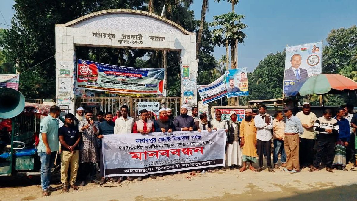 নাগরপুর–টাঙ্গাইল সড়কের কাজ দ্রুত বাস্তবায়নের দাবিতে মানববন্ধন