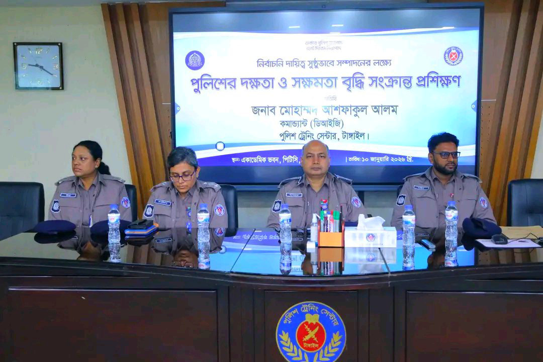 নির্বাচনী দায়িত্বে পুলিশের দক্ষতা ও সক্ষমতা বাড়াতে টাঙ্গাইলে TOT কোর্স উদ্বোধন থাকবে পুলিশ জনপদে ভোট দিবেন নিরাপদে এই স্লোগানকে সামনে রেখে আসন্ন জাতীয় নির্বাচনকে সামনে রেখে সুষ্ঠু, অবাধ ও নিরপেক্ষ ভোটগ্রহণ নিশ্চিত করতে বাংলাদেশ পুলিশের পেশাগত দক্ষতা ও সক্ষমতা বৃদ্ধিতে বিশেষ গুরুত্ব দেওয়া হয়েছে। এরই অংশ হিসেবে পুলিশ হেডকোয়ার্টার্সের উদ্যোগে ইন্সপেক্টর থেকে কনস্টেবল পদমর্যাদার পুলিশ সদস্যদের জন্য প্রশিক্ষণ কর্মসূচি গ্রহণ করা হয়েছে।এই ধারাবাহিক কর্মসূচির অংশ হিসেবে শনিবার (১০ জানুয়ারি ২০২৬) টাঙ্গাইলের পুলিশ ট্রেনিং সেন্টার (পিটিসি)-এ নির্বাচনী দায়িত্ব সফলভাবে সম্পাদনের লক্ষ্যে পুলিশের দক্ষতা ও সক্ষমতা বৃদ্ধি সংক্রান্ত TOT কোর্স এর চতুর্থ পর্যায়ের ২৫তম ধাপের আনুষ্ঠানিক উদ্বোধন অনুষ্ঠিত হয়। উদ্বোধনী অনুষ্ঠানে ঊর্ধ্বতন কর্মকর্তাদের উপস্থিতিকোর্স উদ্বোধনী অনুষ্ঠানে প্রধান অতিথি হিসেবে উপস্থিত ছিলেন পিটিসি টাঙ্গাইলের কমান্ড্যান্ট জনাব মোহাম্মদ আশফাকুল আলম, ডিআইজি। অনুষ্ঠানে তিনি প্রশিক্ষণার্থীদের উদ্দেশে বলেন, নির্বাচন একটি রাষ্ট্রের সবচেয়ে গুরুত্বপূর্ণ গণতান্ত্রিক প্রক্রিয়া। এই প্রক্রিয়া শান্তিপূর্ণ ও নিরপেক্ষভাবে সম্পন্ন করতে মাঠপর্যায়ে দায়িত্ব পালনকারী পুলিশ সদস্যদের পেশাদারিত্ব, আইনগত জ্ঞান ও পরিস্থিতি মোকাবিলার সক্ষমতা অত্যন্ত জরুরি। অনুষ্ঠানে আরও উপস্থিত ছিলেন—জনাব কাজী রুবাইয়াত রুমি,অতিরিক্ত পুলিশ সুপার (সুপার নিউমারারি পুলিশ সুপার পদে পদোন্নতিপ্রাপ্ত)জনাব সাকিবুল ইসলাম খান, অতিরিক্ত পুলিশ সুপার (সুপার নিউমারারি পুলিশ সুপার পদে পদোন্নতিপ্রাপ্ত) (প্রশাসন ও অর্থ),এছাড়াও পিটিসি টাঙ্গাইলের ঊর্ধ্বতন কর্মকর্তা, সংশ্লিষ্ট প্রশিক্ষকবৃন্দ এবং কোর্স পরিচালনায় দায়িত্বপ্রাপ্ত পুলিশ সদস্যরা উপস্থিত ছিলেন।৫০ জন প্রশিক্ষণার্থীর অংশগ্রহণকোর্সটিতে টাঙ্গাইল জেলা পুলিশ থেকে মনোনীত মোট ৫০ জন পুলিশ সদস্য অংশগ্রহণ করছেনপ্রশিক্ষণার্থীরা নির্বাচনী আইন, ভোটকেন্দ্রের নিরাপত্তা ব্যবস্থাপনা, আচরণবিধি বাস্তবায়ন, ঝুঁকি নিরূপণ, জনশৃঙ্খলা রক্ষা, সংঘাত ব্যবস্থাপনা এবং ভোটারদের নিরাপত্তা নিশ্চিতকরণসহ বিভিন্ন গুরুত্বপূর্ণ বিষয়ে প্রশিক্ষণ গ্রহণ করবেন।পুলিশের ভূমিকা তুলে ধরলেন প্রধান অতিথিপ্রধান অতিথি তাঁর বক্তব্যে বলেন,থাকবে পুলিশ জনপদে, ভোট দিবেন নিরাপদে—এই প্রত্যয়ে পুলিশ বাহিনী জনগণের পাশে থেকে দায়িত্ব পালন করবে। অবাধ ও নিরপেক্ষ নির্বাচন নিশ্চিত করতে প্রশিক্ষিত পুলিশ বাহিনীর কোনো বিকল্প নেই।তিনি আরও বলেন, এই TOT কোর্সের মাধ্যমে প্রশিক্ষণপ্রাপ্ত কর্মকর্তারা ভবিষ্যতে মাঠপর্যায়ে দায