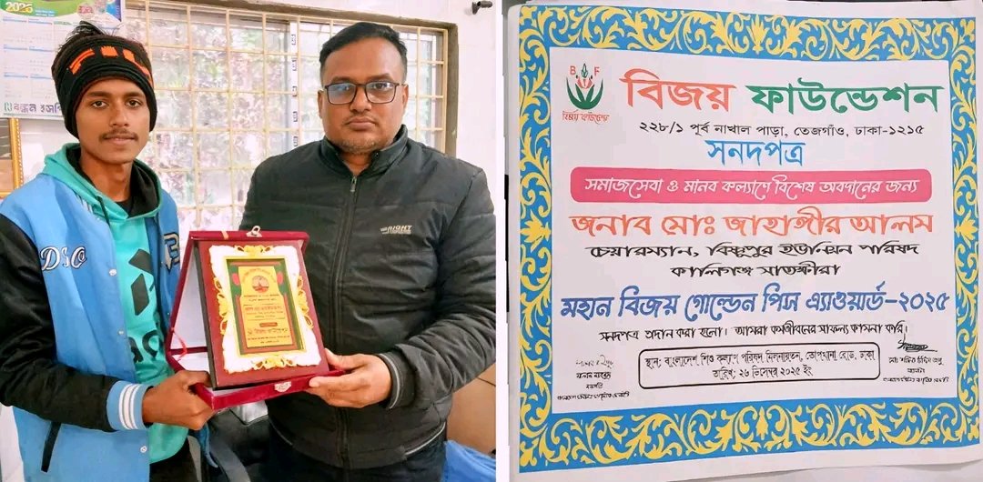 মোস্তফা মাসুদ: সমাজসেবা ও মানবকল্যাণে বিশেষ অবদানের স্বীকৃতিস্বরূপ সাতক্ষীরার কালিগঞ্জ উপজেলার বিষ্ণুপুর ইউনিয়ন পরিষদের চেয়ারম্যান ও সাবেক উপজেলা বিএনপির ছাত্রবিষয়ক সম্পাদক মো. জাহাঙ্গীর আলমকে ‘মহান বিজয় গোল্ডেন পিস অ্যাওয়ার্ড -২০২৫’ প্রদান করা হয়েছে।বৃহস্পতিবার (৮ জানুয়ারি ২০২৬) বেলা ১১টায় চেয়ারম্যানের নিকট আনুষ্ঠানিক ভাবে এ সম্মাননা ও সনদপত্র হস্তান্তর করা হয়। অনুষ্ঠানে বিজয় ফাউন্ডেশনের প্রতিনিধি হাবিবুর রহমান চেয়ারম্যানের হাতে সনদপত্র তুলে দেন।সনদপত্রে উল্লেখ করা হয়, সমাজসেবা ও মানবকল্যাণে চেয়ারম্যান মো.জাহাঙ্গীর আলমের ধারাবাহিক ও আন্তরিক অবদান প্রশংসনীয়। একই সঙ্গে তাঁর ভবিষ্যৎ কর্মজীবনের সার্বিক সাফল্য কামনা করা হয়। সম্মাননা প্রাপ্তির প্রতিক্রিয়ায় মো. জাহাঙ্গীর আলম বলেন,এই স্বীকৃতি আমাকে আরও দায়িত্বশীল করে তুলেছে। মানুষের কল্যাণে কাজ করে যাওয়ার অনুপ্রেরণা হিসেবে এ সম্মাননা আমি বিষ্ণুপুর ইউনিয়নের সর্বস্তরের জনগণের প্রতি উৎসর্গ করছি।উল্লেখ্য,বিজয় ফাউন্ডেশন দীর্ঘদিন ধরে সমাজসেবা, মানবিক কার্যক্রম ও শান্তি প্রতিষ্ঠায় বিশেষ অবদান রাখা ব্যক্তি ও প্রতিষ্ঠানকে সম্মাননা প্রদান করে আসছে।