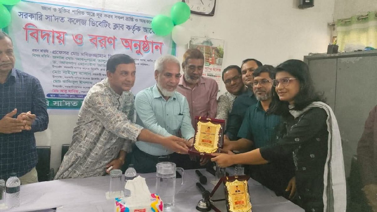 ১৮ নভেম্বর, মঙ্গলবার আমাদের ডিবেটিং ক্লাবে অনুষ্ঠিত হলো ২০২৪–২৫ সেশনের বিদায়ী কমিটির সভাপতি সানজিদা মেহের নাহিদা ও সাধারণ সম্পাদক শাহারিয়ার রাহমান সাজিদ এর বিদায় এবং নতুন কমিটি (২০২৫–২৬) ও নতুন তার্কিকদের আনুষ্ঠানিক বরণ অনুষ্ঠান। অনুষ্ঠানটি ছিল প্রাণবন্ত, উৎসবমুখর এবং আবেগঘন। ক্লাবের পুরনো ও নতুন প্রজন্ম একসাথে মিলিত হয়ে এক সুন্দর পরিবেশ সৃষ্টি করে। অনুষ্ঠানে প্রধান অতিথি হিসেবে উপস্থিত ছিলেন: অধ্যক্ষ প্রফেসর মো. মনিরুজ্জামান মিয়া, সাবেক উপাধ্যক্ষ প্রফেসর সুব্রত কুমার সাহা ও সাবেক উপাধ্যক্ষ ও ভারপ্রাপ্ত অধ্যক্ষ মৃদুনচন্দ্র ।বিশেষ অতিথি হিসেবে উপস্থিত ছিলেন: আব্দুল্যাহ তালুকদার সাধারণ -সম্পাদক, সরকারি সাদ'ত কলেজ শিক্ষক পরিষদ, ড. আরমান হোসেন আজম সহকারি অধ্যাপক, বাংলা ও শিক্ষক উপদেষ্টা, সরকারি সা'দত কলেজ ডিবেটিং ক্লাব,মো. নাইমুল হাসান সহকারী অধ্যাপক ইসলামী শিক্ষা ও শিক্ষক উপদেষ্টা, সরকারি সা'দত কলেজ ডিবেটিং ক্লাব, সাইফুল মালেক আনসারি, বিভাগীয় প্রধান অর্থনীতি, আবেদ আহাদ, বিভাগীয় প্রধান, সমাজকর্ম। উক্ত অনুষ্ঠানে সভাপতিত্ব করেন মোঃ আবু হানিফ, সভাপতি সরকারি সা'দত কলেজ ডিবেটিং ক্লাব। সাথে উপস্থিত ছিলেন ক্লাবের গর্ব, সম্মানিত সাবেকরা: প্রতিষ্ঠাকালীন সাধারণ সম্পাদক ও জেলা শিশু বিষয়ক কর্মকর্তা খন্দকার নিপুণ হোসাইন,সাবেক সভাপতি মিজানুর রহমান রুবেল,সাবেক সভাপতি রুহুল আমিন,সাবেক সাধারণ সম্পাদক নাসির উদ্দীন,সাবেক সভাপতি আবু আহমেদ শেরশাহ,সাধারণ সম্পাদক মাহতাব হাসান ও এছাড়াও সরকারি সা'দত কলেজ বৈষম্য বিরোধী ছাত্র আন্দোলন, সরকারি সা'দত কলেজ ছাত্রদলের সদস্য , সরকারি সা'দত কলেজ ছাত্রশিবির। এসময় বিদায়ী কমিটির সদস্যদের ক্রেস্ট ও ফুল দিয়ে সম্মাননা জানানো হয় এবং নতুন কমিটি ও সদস্যদের ফুলেল শুভেচ্ছা জানিয়ে স্বাগত জানানো হয়। আলোচনা পর্বে ক্লাবের অর্জন, অতীত ইতিহাস, ভবিষ্যৎ পরিকল্পনা, ক্লাবের সম্ভাবনা, বর্তমান কার্যক্রম সহ বিভিন্ন বিষয়ে আলোচনা করেন সম্মানিত অতিথিবৃন্দ। ক্লাবের সদস্যরা রম্য বিতর্ক, গান, ম্যাজিক ও আবৃত্তির মাধ্যমে অনুষ্ঠানকে প্রাণবন্ত করে তুলেছিলো। অংশগ্রহণকারী সবাইকে অশেষ ধন্যবাদ ও কৃতজ্ঞতা। এই ধারাবাহিকতা অব্যাহত রাখতে সকলের সমর্থন প্রত্যাশা করি। বিদায়ী কমিটির দায়িত্বশীল নেতৃত্ব আমাদের ক্লাবকে শক্ত ভিতের ওপর দাঁড় করিয়েছে। আর নতুন কমিটি ও নতুন তার্কিকরা ক্লাবকে আরও এগিয়ে নিতে অঙ্গীকারবদ্ধ। আমাদের শ্রদ্ধেয় শিক্ষকরা সবসময় ক্লাবের পাশে থেকেছেন। তাদের দিকনির্দেশনা, সহযোগিতা এবং একান্ত সমর্থনই অনুষ্ঠানটিকে এত সুন্দরভাবে আয়োজন করতে সাহায্য করেছে। তাদের প্রতি আমরা কৃতজ্ঞ। বিশেষভাবে কৃতজ্ঞতা জানাচ