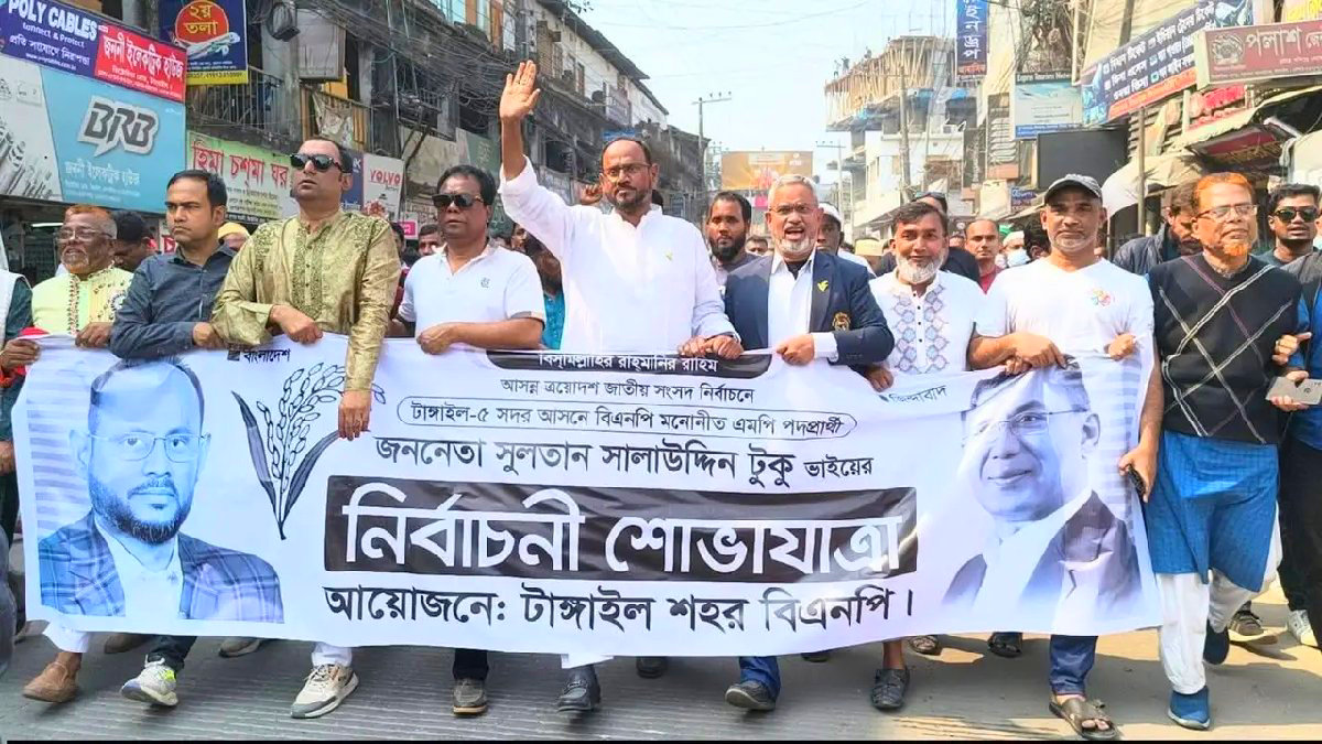টাঙ্গাইল সদর–০৫ আসনে ধানের শীষের প্রার্থী আলহাজ্ব সুলতান সালাউদ্দিন টুকুর পক্ষে শহর বিএনপির নির্বাচনী মিছিল আসন্ন ত্রয়োদশ জাতীয় সংসদ নির্বাচনকে সামনে রেখে টাঙ্গাইল সদর–০৫ আসনের ধানের শীষ প্রতীকের মনোনীত সংসদ সদস্য প্রার্থী আলহাজ্ব সুলতান সালাউদ্দিন টুকু–এর পক্ষে টাঙ্গাইল শহর বিএনপির উদ্যোগে এক বিশাল নির্বাচনী মিছিল অনুষ্ঠিত হয়েছে। মঙ্গলবার (তারিখ উল্লেখযোগ্য) বিকেলে টাঙ্গাইল শহরের গুরুত্বপূর্ণ সড়ক প্রদক্ষিণ করে মিছিলটি। মিছিলের শুরুতেই ছিল ধানের শীষ প্রতীকের ব্যানার ফেস্টুন ও প্ল্যাকার্ড। নেতাকর্মীরা বিএনপির ভারপ্রাপ্ত চেয়ারম্যান তারেক রহমানের নির্দেশনা বাস্তবায়ন গণতন্ত্র পুনরুদ্ধার এবং ভোটাধিকার ফিরিয়ে দেওয়ার দাবিতে বিভিন্ন স্লোগান দেন। মিছিলে উপস্থিত নেতারা বলেন আলহাজ্ব সুলতান সালাউদ্দিন টুকু টাঙ্গাইলের মানুষের পরীক্ষিত নেতা। অতীতে তাঁর নেতৃত্বে এ এলাকার উন্নয়ন ও জনগণের অধিকার রক্ষায় গুরুত্বপূর্ণ ভূমিকা পালন করা হয়েছে। তারা আশা প্রকাশ করেন জনগণের স্বতঃস্ফূর্ত সমর্থনে ধানের শীষ এবার বিজয়ী হবে। মিছিলে টাঙ্গাইল শহর বিএনপি ও এর অঙ্গ ও সহযোগী সংগঠনের বিপুল সংখ্যক নেতাকর্মী অংশগ্রহণ করেন। পুরো কর্মসূচি শান্তিপূর্ণভাবে সম্পন্ন হয়।