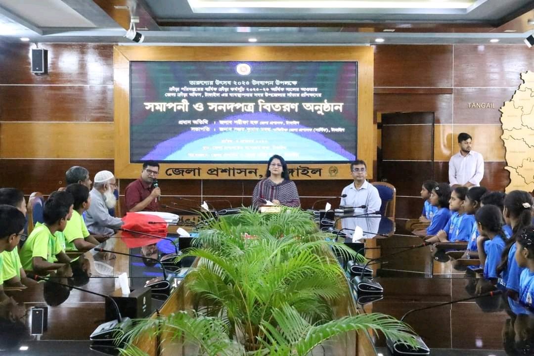 সোমবার ০৩নভেম্বর২০২৫ তারিখ জেলা প্রশাসক, টাঙ্গাইল-এর কার্যালয়ে ‘তারুণ্যের উৎসব-২০২৫’ উদযাপন উপলক্ষ‍্যে জেলা ক্রীড়া অফিস, টাঙ্গাইল-এর ব্যবস্থাপনায় সদর উপজেলায় আয়োজিত সাঁতার প্রশিক্ষণের সমাপনী ও সনদপত্র বিতরণ অনুষ্ঠিত হয়। অনুষ্ঠানে ৪০ জন প্রশিক্ষণার্থীর হাতে সনদপত্র তুলে দেন জেলা প্রশাসক, টাঙ্গাইল। টাংগাইলের ক্রীড়া অনুরাগী শিক্ষার্থীদের অনুপ্রেরণা দিতে জেলা প্রশাসক জনাব শরীফা হক সর্বত্র ব্যবস্থা এবং তাঁদের সুযোগ সুবিধা দিতে বিশেষ নিদের্শ দেন। পুরষ্কার বিতরণ করেন সবাইকে সাথে নিয়ে আগামীতে তারুণ্যের জয়গান নিয়ে সামনের পথ চলার আহ্বান জানিয়েছেন।