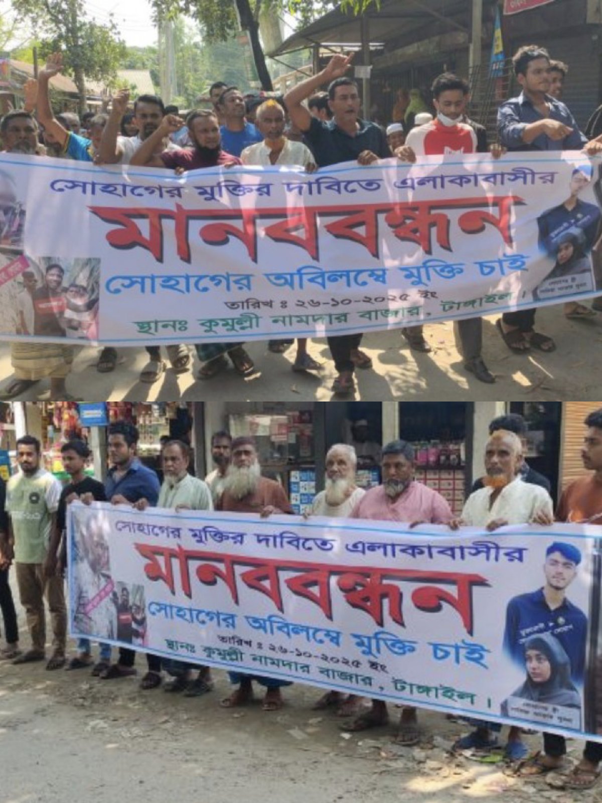 টাঙ্গাইলের সদর উপজেলার করটিয়া নামদার কুমিল্লি গ্রামে প্রেমের অভিযোগে কারাগারে থাকা যুবকের মুক্তির দাবিতে মানববন্ধন করেছে গ্রামবাসী। রোববার (২৬ অক্টোবর ২০২৫) করটিয়া ইউনিয়নের নামদার কুমিল্লি বাজারে এলাকাবাসীর উদ্যোগে এ মানববন্ধন অনুষ্ঠিত হয়। এই মানববন্ধনে অংশ নেয় এলাকার শত শত মানুষ যেটি একটি অন্যরকম আলোড়নায় সৃষ্টি হয় এবং প্রশাসনকে উল্লেখ করে বলা হয় যে সোহাগের নামে যে মিথ্যা এবং অন্যায় ভাবে তাকে কারাগারে নির্যাতন করা হচ্ছে এর বিরুদ্ধে এলাকাবাসী সোচ্চার এবং তাকে ছেড়ে দেওয়া না হলে কঠোর আন্দোলনের হুশিয়ার এলাকাবাসীর। মানববন্ধনে বক্তব্য রাখেন গ্রামের হিতৈষী ব্যক্তিবর্গ হাফিজ উদ্দিন ভুইয়া, খলিলুর রহমান, আশরাফ আলী মিঞা,ফরিদ মিঞা ,মজিবর রহমান মিঞা, আবুল কালাম আজাদ, মো. জাহিদ মিয়া ও ফরিদ মিয়া প্রমুখ। নামদার কুমল্লী গ্রামের মো. সহিদুল ইসলামের ছেলে মো. সোহাগ মিয়া (২৩) দীর্ঘদিন ধরে একই গ্রামের মো. লোমান মিয়ার মেয়ে নাফিছা আক্তার লুবনার সঙ্গে প্রেমের সম্পর্কে জড়িত ছিলেন। এই সম্পর্কের সূত্র ধরে লুবনা গত দুই বছরে একাধিকবার সোহাগের বাড়িতে গিয়েছিলেন। প্রতিবারই স্থানীয় গণ্যমান্য ব্যক্তিরা মেয়েটিকে বুঝিয়ে তার বাবার বাড়িতে পৌঁছে দেন। সম্প্রতি লুবনা আবারও প্রেমিক সোহাগের কাছে চলে এলে ক্ষিপ্ত হয়ে তার পিতা লোমান মিয়া সোহাগের বিরুদ্ধে নারী ও শিশু নির্যাতন দমন আইনে অপহরণের অভিযোগে মামলা দায়ের করেন। মামলা নম্বর—নারী ও শিশু ১৫৭/২৫। বর্তমানে ওই মামলায় সোহাগ চার মাস ধরে টাঙ্গাইল জেলা কারাগারে বন্দি আছেন। বক্তারা অভিযোগ করেন, মেয়ের পিতা প্রভাবশালী হওয়ায় তিনি ক্ষমতার অপব্যবহার করে প্রেমের সম্পর্ককে ‘অপহরণ’ আখ্যা দিয়ে মামলাটি দায়ের করেছেন। তারা অবিলম্বে সোহাগের নিঃশর্ত মুক্তি দাবি করেন এবং মুক্তি না পেলে কঠোর আন্দোলনের হুঁশিয়ারি দেন। মানববন্ধনে সোহাগের বাবা সহিদুল ইসলাম ও মা সুর্যভানু কান্নাজড়িত কণ্ঠে ছেলের মুক্তির আবেদন জানান। মানববন্ধন শেষে নামদার কুমিল্লি বাজার থেকে এক বিক্ষোভ মিছিল বের করা হয়।