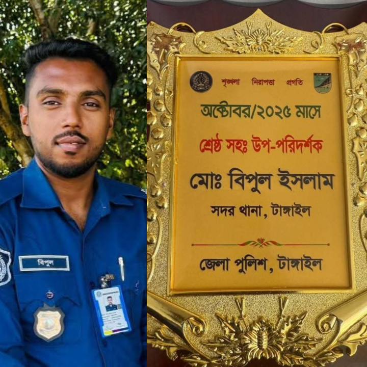 বৃহস্পতিবার, ২০ নভেম্বর ২০২৫ ইং তারিখে, টাঙ্গাইল সদর থানায় কর্মরত সহকারী উপ-পরিদর্শক (এএসআই) মো. বিপুল ইসলাম তাঁর কর্মদক্ষতা ও সততা স্বীকৃতি স্বরূপ অক্টোবর ২০২৫ মাসের টাঙ্গাইল জেলার শ্রেষ্ঠ অফিসার নির্বাচিত হয়েছেন। ‎ ‎জেলার আইন-শৃঙ্খলা রক্ষা এবং জনসেবায় তাঁর প্রশংসনীয় ভূমিকার জন্য তিনি এই সম্মাননা লাভ করেন। জেলার মাসিক অপরাধ পর্যালোচনা ও কল্যাণ সভায় আজ বিপুল ইসলামকে আনুষ্ঠানিকভাবে এই সম্মাননা জানানো হয়েছে। ‎ টাঙ্গাইল জেলা পুলিশের মাসিক সভায় অনুষ্ঠানের মাধ্যমে এএসআই মো. বিপুল ইসলামকে শ্রেষ্ঠ অফিসার হিসেবে সম্মাননা ক্রেস্ট উপহার দেওয়া হয়।