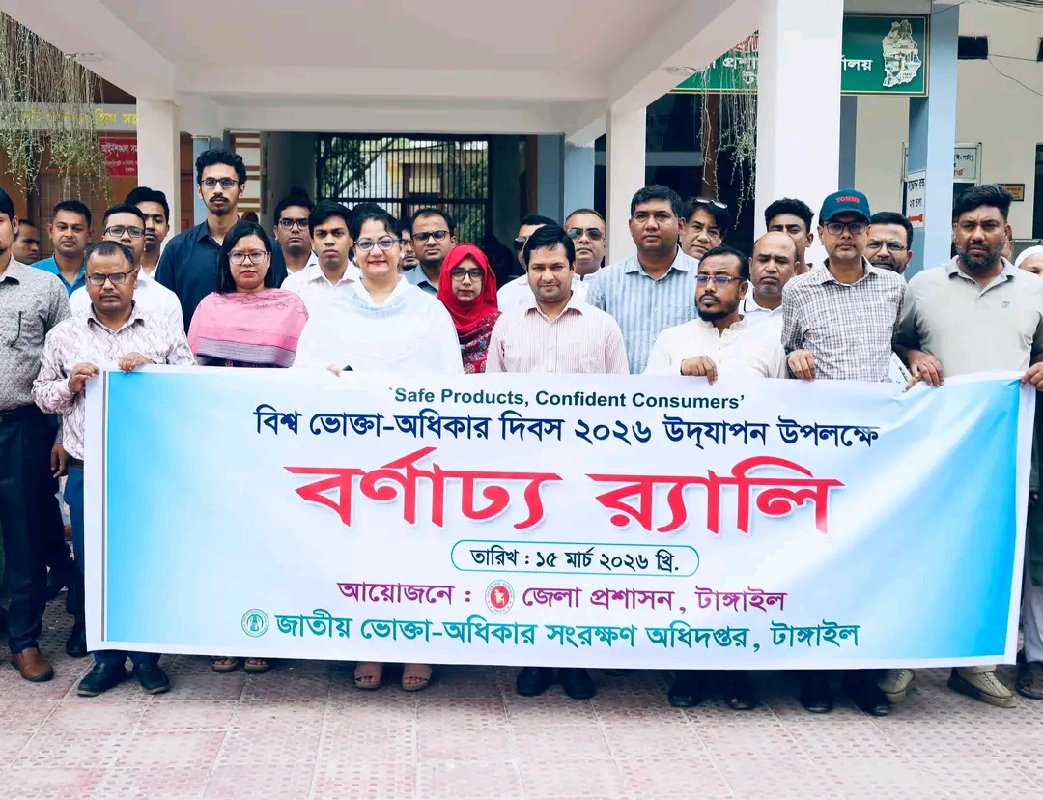 টাঙ্গাইলে বিশ্ব ভোক্তা অধিকার দিবস ২০২৬ উদযাপন “নিরাপদ পণ্য, আত্মবিশ্বাসী ভোক্তা” প্রতিপাদ্যকে সামনে রেখে টাঙ্গাইলে বর্ণাঢ্য আয়োজনের মধ্য দিয়ে বিশ্ব ভোক্তা অধিকার দিবস ২০২৬ উদযাপন করা হয়েছে।শনিবার (১৫ মার্চ ২০২৬) সকালে জেলা প্রশাসকের কার্যালয় প্রাঙ্গণ থেকে একটি বর্ণাঢ্য র্যালি বের করা হয়। র্যালিটি শহরের বিভিন্ন গুরুত্বপূর্ণ সড়ক প্রদক্ষিণ করে পুনরায় জেলা প্রশাসকের কার্যালয়ে এসে শেষ হয়। এতে বিভিন্ন সরকারি দপ্তরের কর্মকর্তা শিক্ষার্থী ভোক্তা অধিকার সংশ্লিষ্ট সংগঠনের প্রতিনিধি এবং সুশীল সমাজের সদস্যরা অংশগ্রহণ করেন।র্যালি শেষে জেলা প্রশাসকের কার্যালয়ের সম্মেলন কক্ষে এক আলোচনা সভা অনুষ্ঠিত হয়। সভায় সভাপতিত্ব করেন টাঙ্গাইলের জেলা প্রশাসক। বক্তারা বলেন ভোক্তাদের অধিকার নিশ্চিত করতে বাজার তদারকি জোরদার করা ভেজাল ও নকল পণ্যের বিরুদ্ধে কঠোর ব্যবস্থা নেওয়া এবং ভোক্তাদের সচেতনতা বৃদ্ধি করা অত্যন্ত জরুরি।আলোচনা সভায় বক্তারা আরও বলেন নিরাপদ পণ্য নিশ্চিত করা হলে ভোক্তাদের মধ্যে আস্থা বাড়বে এবং একটি সুস্থ বাজার ব্যবস্থা গড়ে উঠবে। এজন্য সংশ্লিষ্ট সব প্রতিষ্ঠান ও সাধারণ ভোক্তাদের সম্মিলিতভাবে কাজ করার আহ্বান জানানো হয়।অনুষ্ঠানে বিভিন্ন সরকারি দপ্তরের কর্মকর্তা ব্যবসায়ী প্রতিনিধি গণমাধ্যমকর্মীসহ নানা শ্রেণি-পেশার মানুষ উপস্থিত ছিলেন।