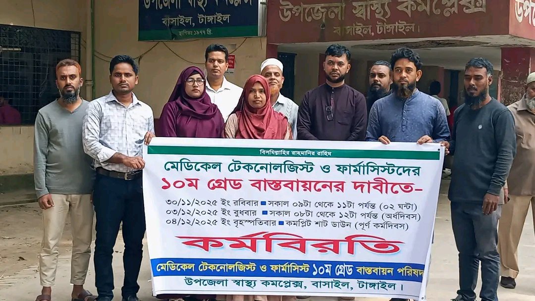 টাঙ্গাইলে দশম গ্রেড বাস্তবায়নের দাবিতে বাসাইলে মেডিকেল টেকনোলজিস্ট ও ফার্মাসিস্টদের দুই ঘণ্টা কর্মবিরতি