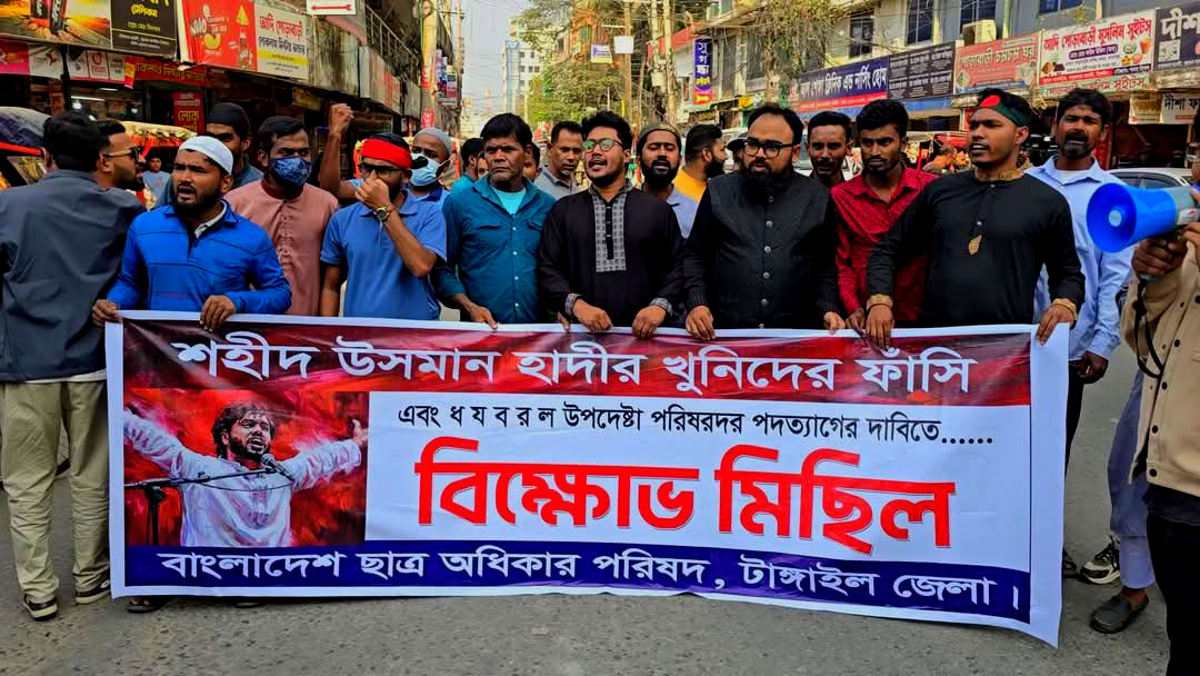 টাঙ্গাইলে ইনকিলাব মঞ্চের মুখ্য পাত্র ওসমান হাদীর ওপর হামলার প্রতিবাদে বিক্ষোভ সমাবেশ